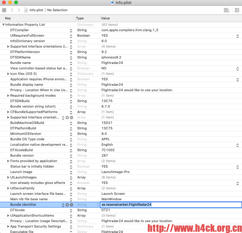 而重签名的应用的bundleid是se.resenatverket.FlightRadar24,如下: